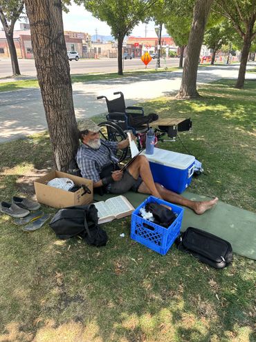 I met Dale at a park on the day we flew home from our daughter's wedding. Dale was sitting in the shade, surrounded by everything he owned, and obviously deep in thought with his pen and paper.